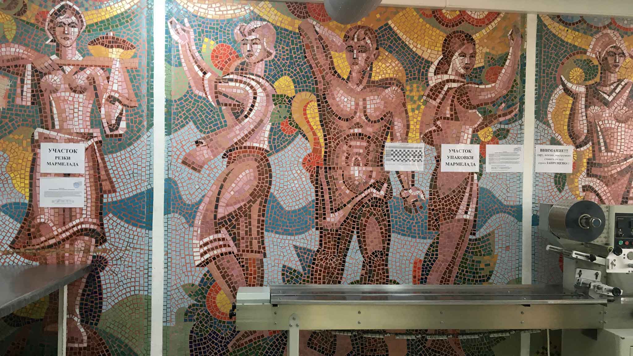 В общем, облачившись в костюм тульской медсестры и тщательно продезинфицировав руки (на входе в цех стоит хитрый механизм, который не пропускает тех, кто плохо обработал конечности), я обошел все цеха. Ожидал увидеть разруху, но ничего такого. Из советского наследия — разве что помещение и мозаика на стене, запечатлевшая, очевидно, пастильное производство.