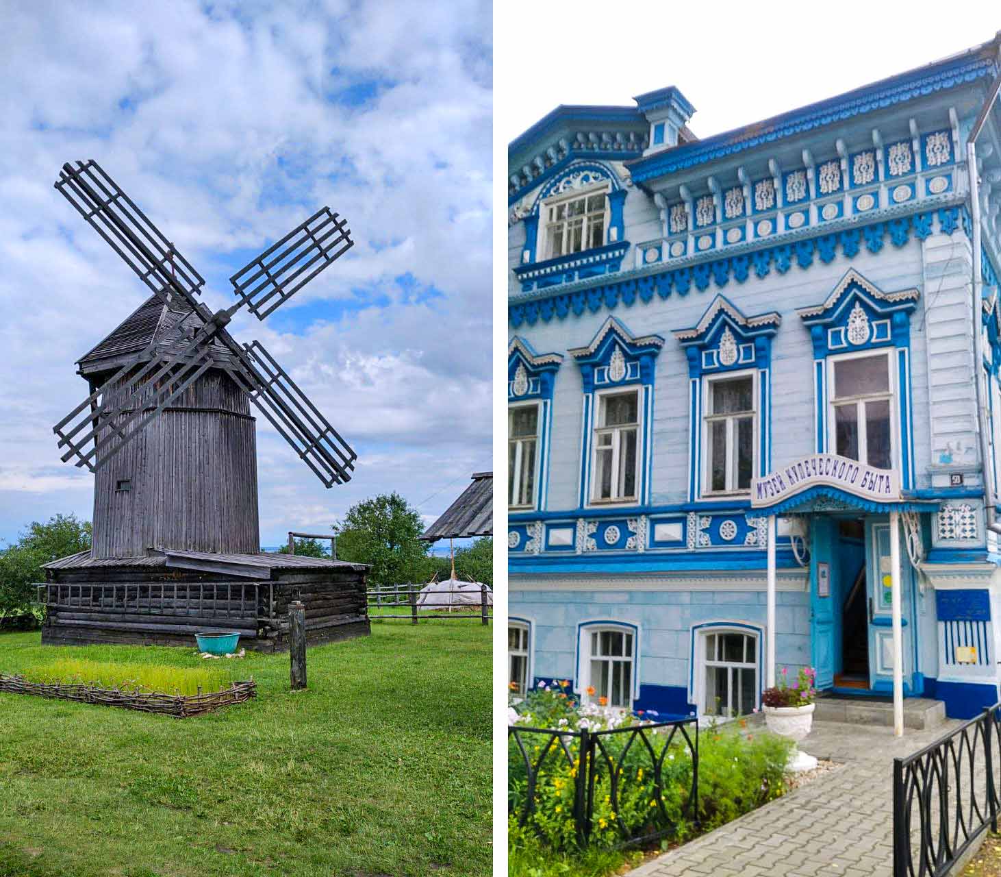 Нас в этом городке интересуют, прежде всего, местные памятники деревянного зодчества и Марийский этнографический музей. Он был создан относительно недавно – в 1983 году к 400-летию Козьмодемьянска, но успел стать настоящей визитной карточкой городка. На его огромной территории под открытым небом представлены: действующая деревянная шатровая красавица-мельница, жилая изба, амбар, кузница, бани (по-чёрному и по-белому), колодец-журавль, шалаш, высокие качели, плетёные заборы.