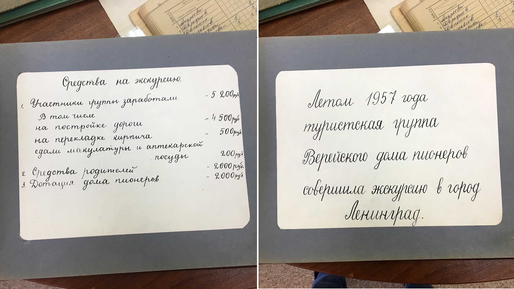 Один был посвящен вояжу школьников по Каме, другой — поездке в Ленинград. На страничках альбома — фотографии или открытки каждого дня путешествия и подробное описание: что видели, во сколько легли спать, чему удивлялись. Замечательный пример того, как люди хранили воспоминания о поездках без айфонов.