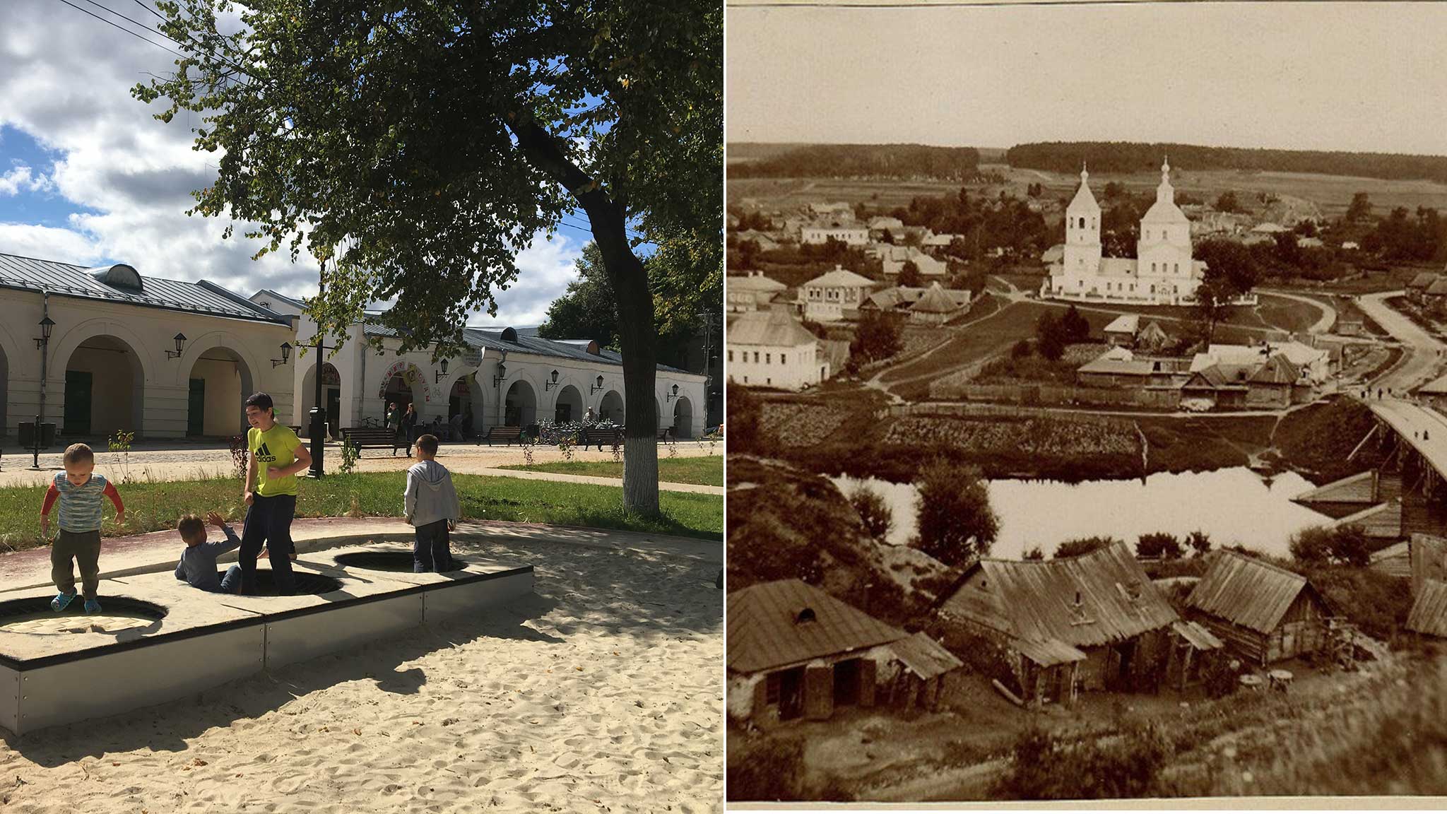 Честно говоря, когда я глянул на город, первой мыслью было, что обоз откопали. Верея преобразилась. Главная площадь города (Советская) сверкала чистотой и свежей реставрацией. Слева — белоснежные, как после кипячения, торговые ряды 19 века, работающие до сих пор. Справа — небольшой фонтанчик и детская площадка, хоть и стилизованная под деревянную старину, но абсолютно новехонькая, с качелями, горками и даже батутами. Дети галдели, вокруг отдыхали на скамейках взрослые, а красивейший рыжий конь с аппетитом хрустел шафрановым яблочком.