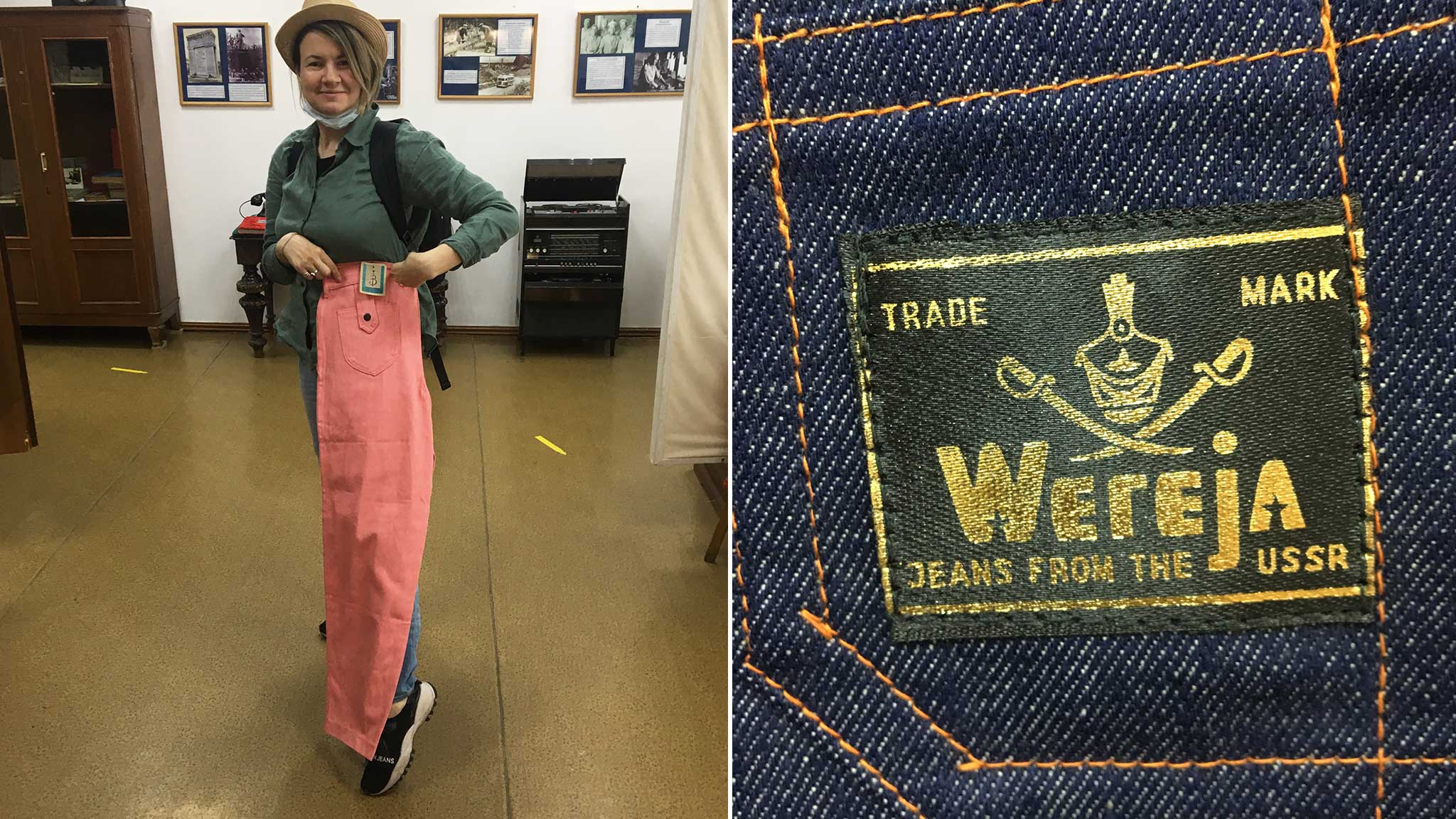 А оказалось, что я пришел не зря. Только здесь понял смысл фразы: «Вещи мейд ин Верея». Такая присказка существовала в девяностые, а может, даже раньше, но смысл ее открылся только сейчас, когда в гостеприимно распахнутом шифоньере музея я обнаружил джинсовые курточку, шорты и брюки. Изделия были причудливого фасона, их можно было трогать и щупать, моя коллега примерила кокетливые джинсы розового цвета и долго радовалась. А я обрадовался еще больше, когда разглядел на каждом артефакте этикетку «Верея» с буквой «В», напоминающей первую букву компании Wrangler. Оказалось, что в Верее располагался швейный комбинат, который первым в стране (аж в шестидесятые годы) освоил производство джинсов! А еще здесь отшивали знаменитые на весь СССР лавсановые костюмы и плащи «Болонья».