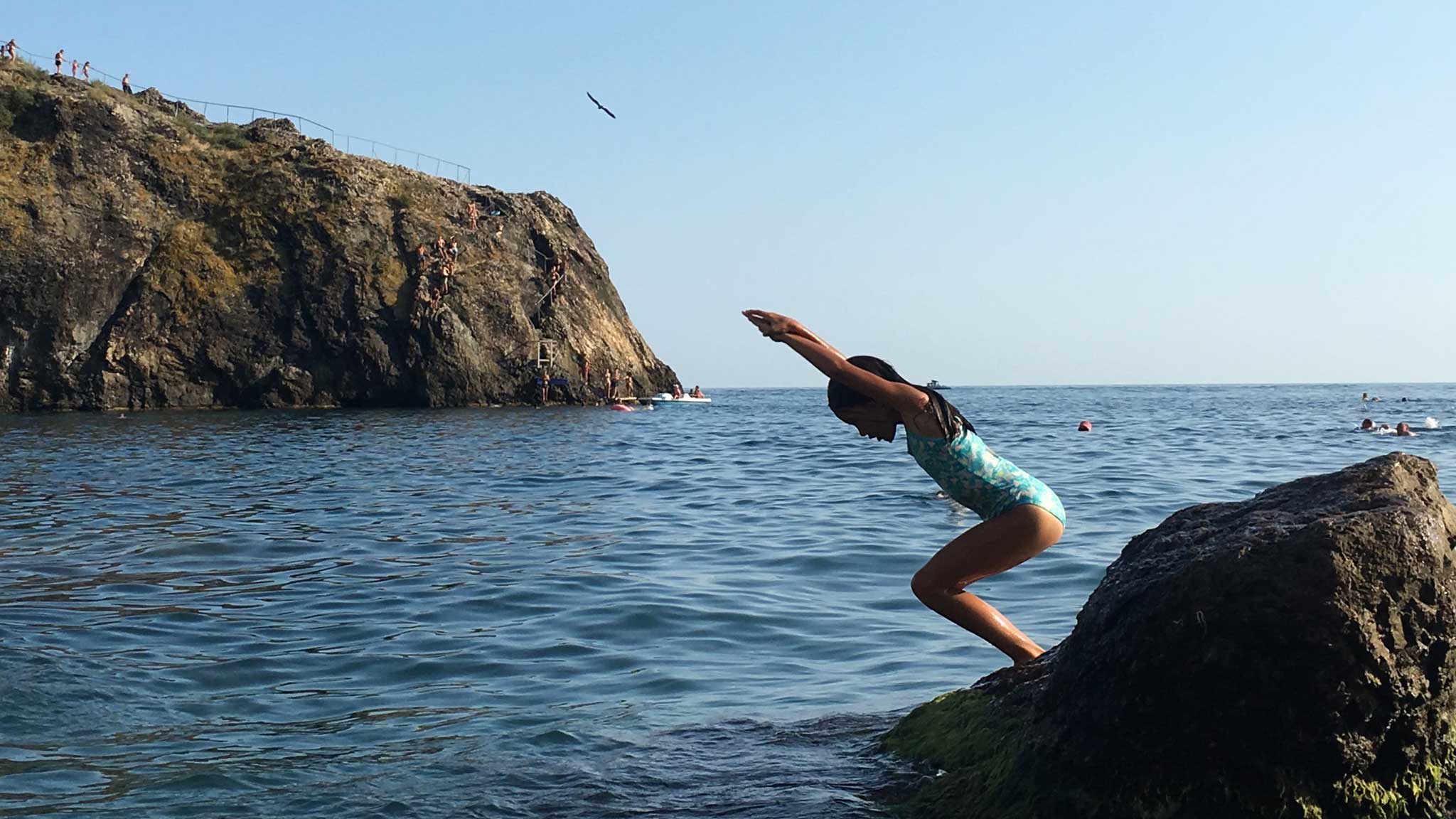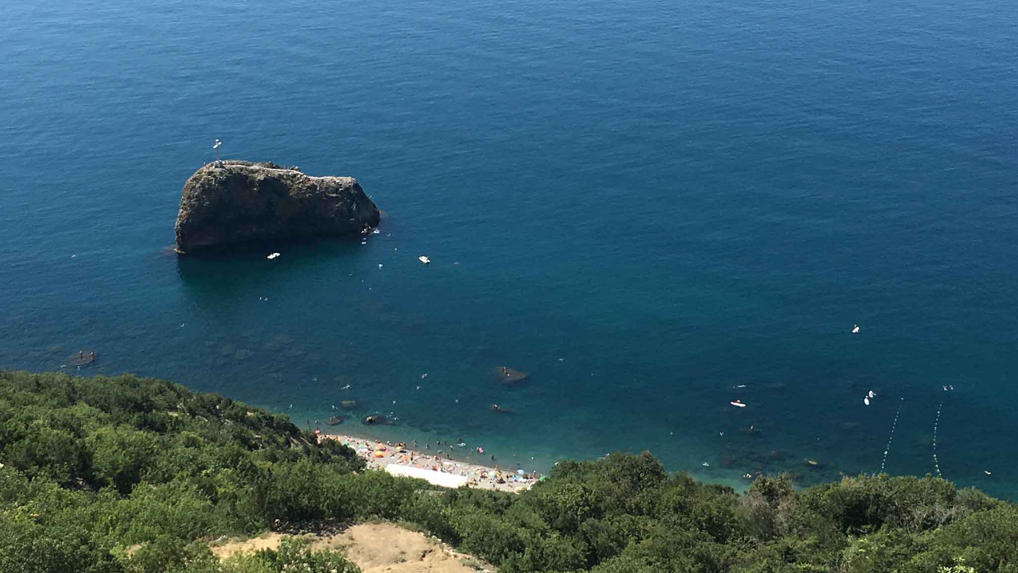 Обрамленный с двух сторон высокими скалами, он словно прячется от посторонних взглядов. Народу здесь достаточно, но меньше, чем на Учкуевке. А все потому, что попасть сюда непросто. Или на катере из Балаклавы (200 рублей за билет) или по лестнице из 800 крутых ступеней.