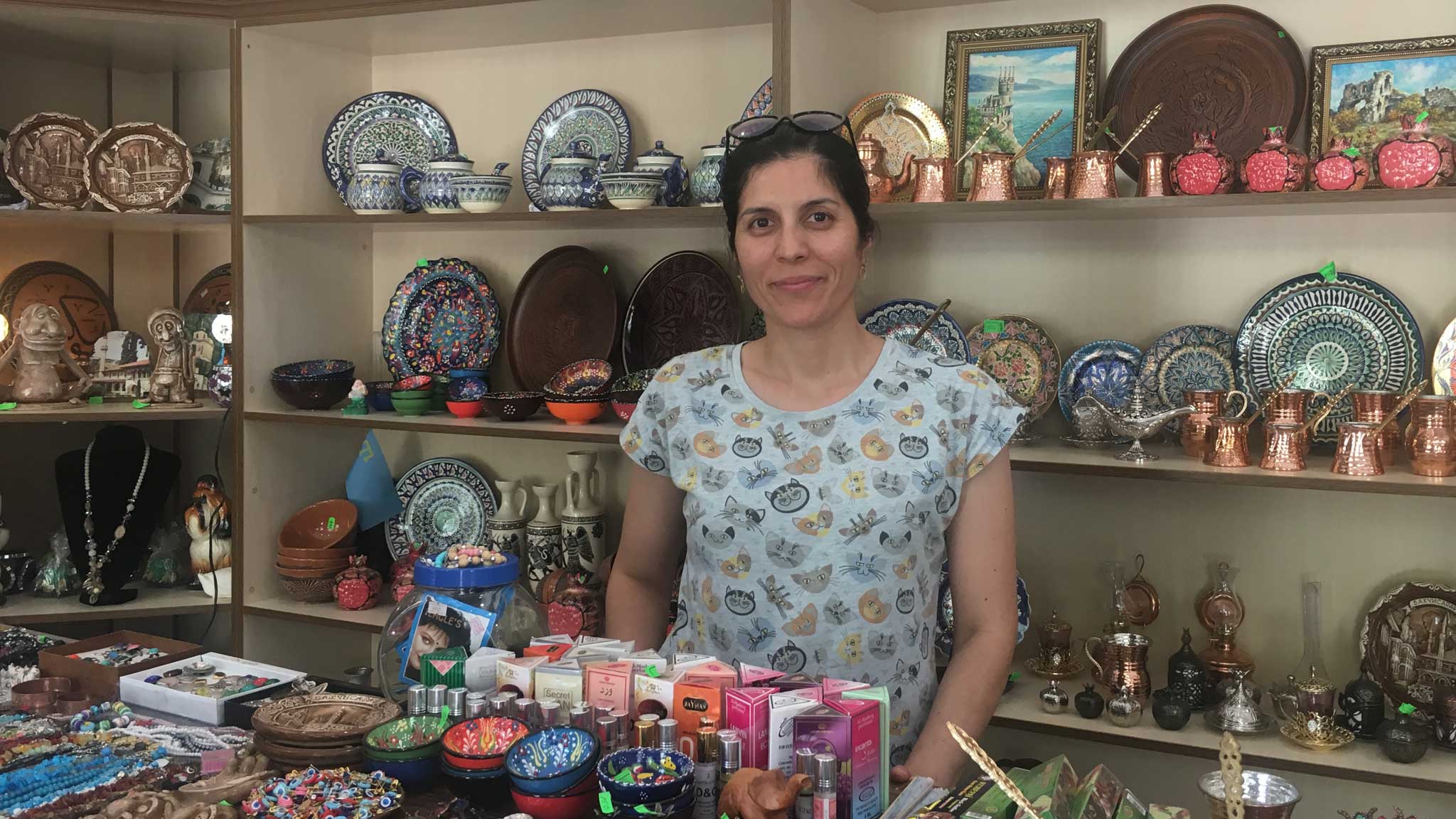 Рядом с «Хош Сефа» сувенирная лавка. Ее хозяйка Ленура — женщина приветливая и словоохотливая. Интересно она рассказывает о своем товаре и при желании покажет вам мастерскую, где ее муж и старший сын Мухамед делают из меди турки для варки кофе и ложечки. Турка стоит около 2000 рублей, ложечка — 300.