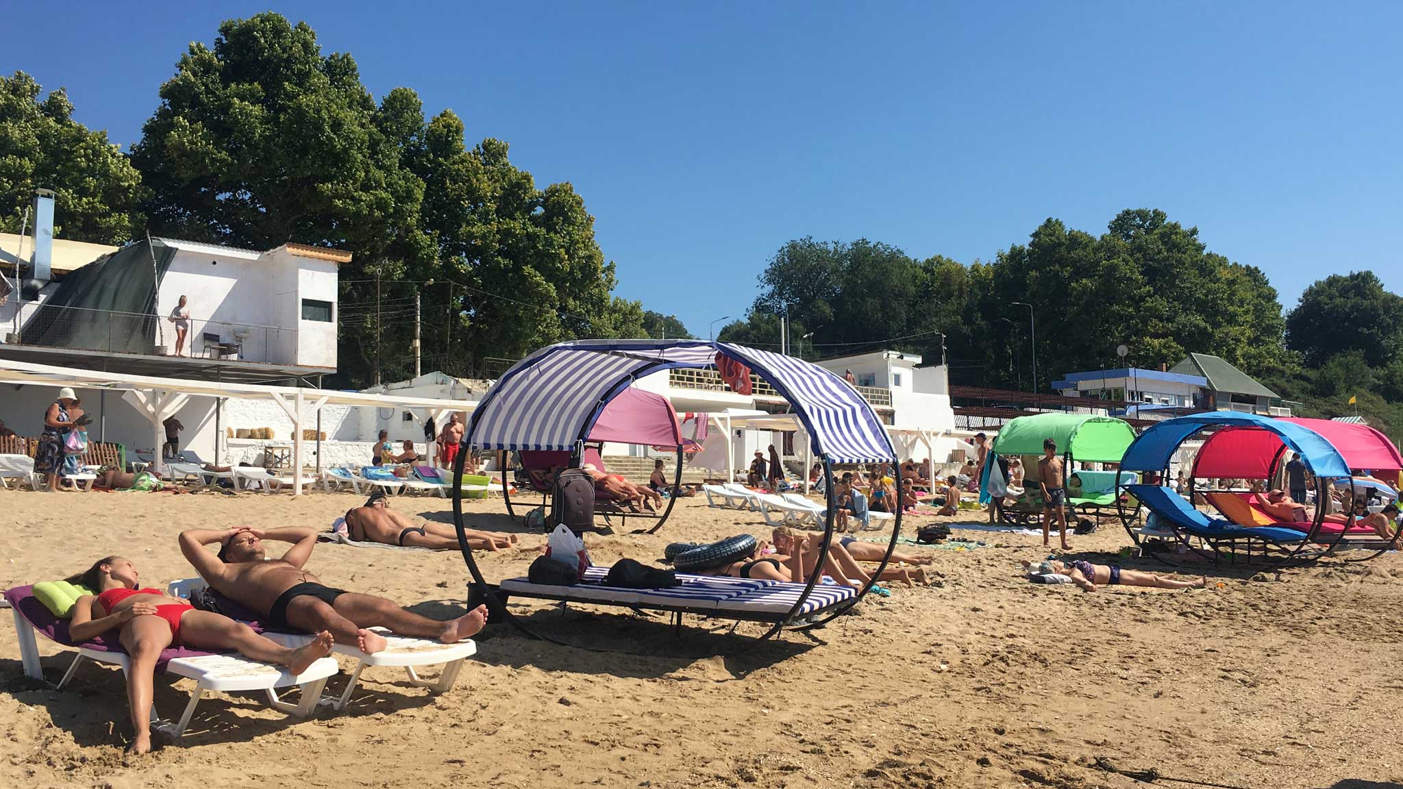 Пляж в Учкуевке — самое популярное место отдыха вблизи Севастополя. Желтый песок, открытое море. Здесь всегда многолюдно и весело. Из динамиков оглушает музыка, работает аниматор.