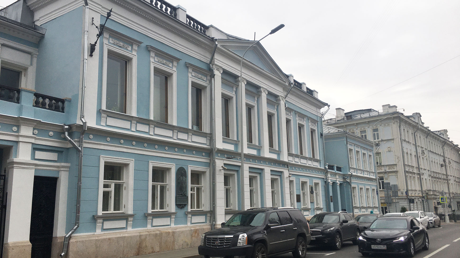 Следующий пункт — дом братьев Фонвизиных. Писатель называл его роскошным особняком с двумя львами у подъезда, которые охраняют дорогие резные двери, отделанные бронзой. Львов, к сожалению, уже нет, а вот двери сохранились. Только за ними теперь не покои баронессы фон Мекк и не Дворянский земельный банк, а Федеральное агентство по рыболовству. На фасаде, как в музее, несколько мемориальных табличек. Среди прочего указано: