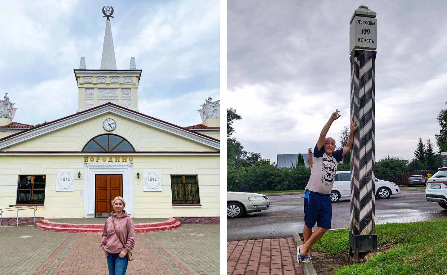 Еще один крюк через станцию Дорохово, и минут через 15 выходим на станции Бородино. Наконец-то! Двукрылый вокзальчик в светло-бежевых тонах под острым шпилем. И даты на фасаде, от которых что-то сжимается внутри: 1812 и 1942. Небо хмурится к дождю: где укрыться на 2000 гектарах Бородинского поля? Набираю спасительный номер, диспетчер по имени Катя принимает «особый заказ»: нужен не просто «водила», наматывающий километраж, нужен знаток этих мест. Пять минут и таковой прибывает! Знакомимся. Сергей родом из соседнего Можайска, таксист старой закалки, таких раньше звали «профессоры дорог».