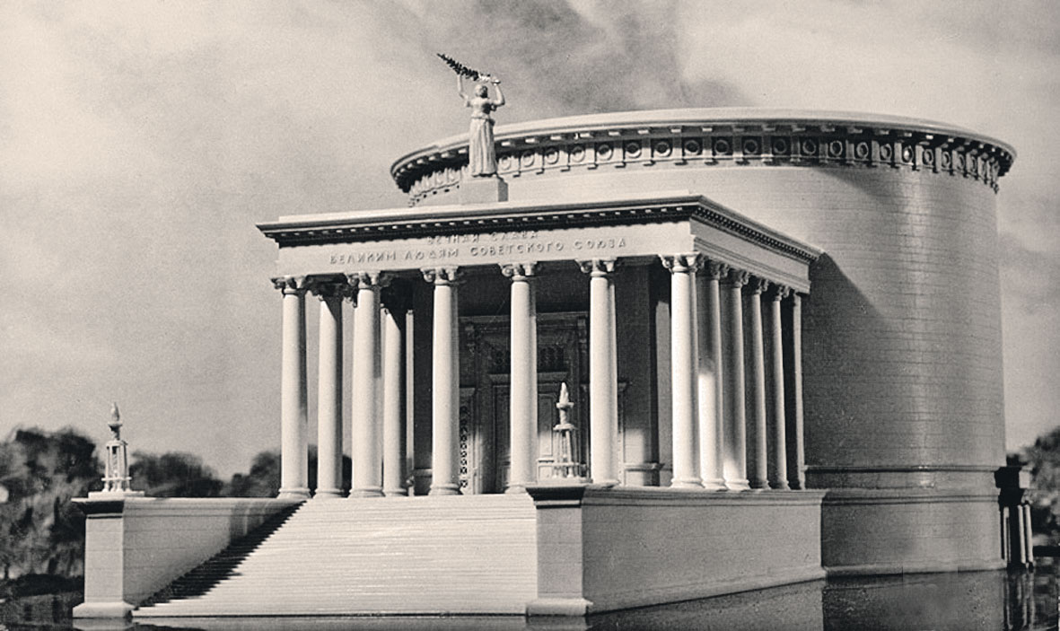 Еще факт. Оказывается, к ГУМу могла примоститься мемориальная усыпальница с саркофагами Ленина и Сталина внутри (вообще в пантеоне планировалось хранить останки выдающихся деятелей КПСС). Архитектор Николай Колли подошел к разработке проекта со всей серьезностью и пустил в ход монументальную скульптуру, барельефы, колонны, мозаику. Понятно, что здание с таким назначением должно быть суровым, величественным и огромным. Чтобы подчеркнуть масштаб личностей, находящихся внутри.