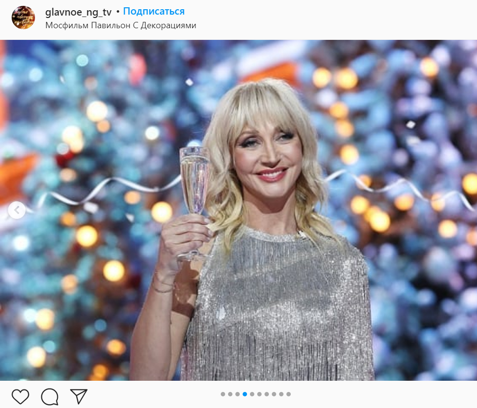 На сцену новогоднего «Голубого огонька» Наталья Подольская вышла в черном платье-бюстье, которое декорировано модными пайетками и бахромой. Женственный наряд Натальи эффектно подчеркивал ее длинные ноги, так как подол платья сделан из сетки.