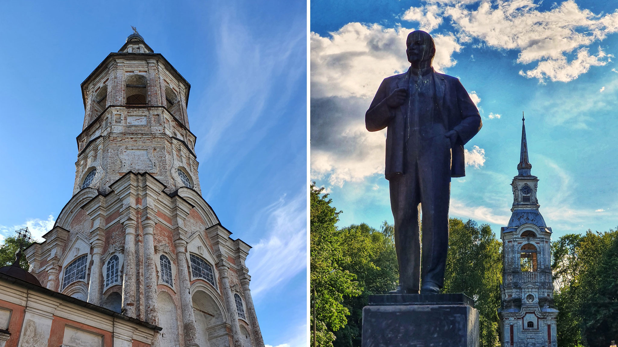 Ну и будете на Селигере — заверните в Осташков. Мы это сделали и не пожалели. Так же, как и Торжок, это городок контрастов. Здесь развалины дореволюционных двухэтажек мирно соседствуют с современными коттеджами. Краеведческий музей до сих пор расположен в стенах храма (музей, кстати, весьма приличный). А памятник Ленину вообще стоит на фоне церковной колокольни, повернувшись к ней спиной. А между ними — фонтан с амурчиками.