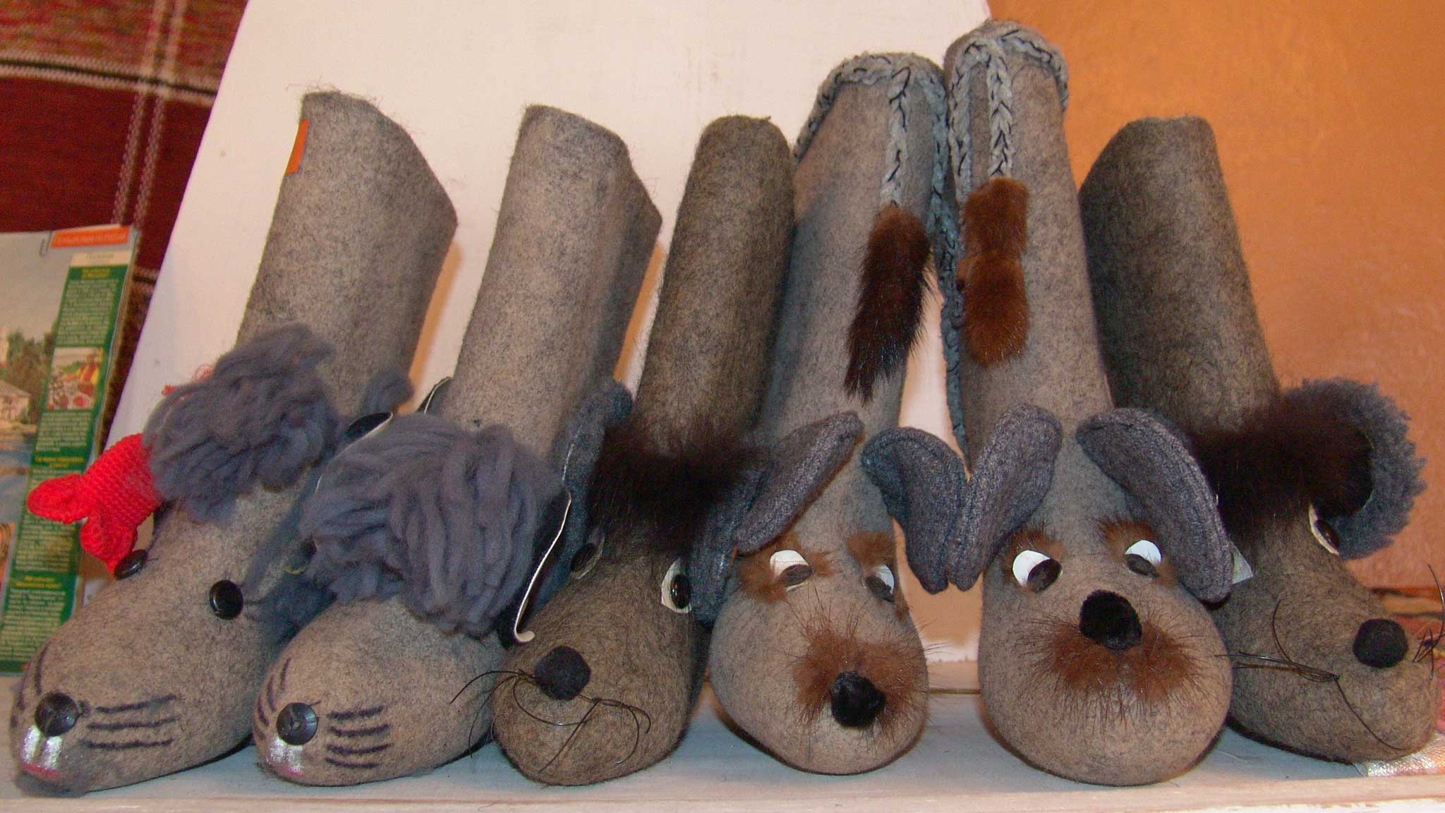В первом (он на втором, господском, этаже) – настоящее царство пимов (это если по-сибирски) и катанок, как у нас в уральской деревне их звали. Обувь, в которой проходил все детство. Вот только тут валенки развешаны, как на новогодней елке игрушки, даже с аппликациями для красоты неземной имеются. Есть даже на каблуках – для городских модниц. Ну и это, само собой, со всякой мышиной символикой.