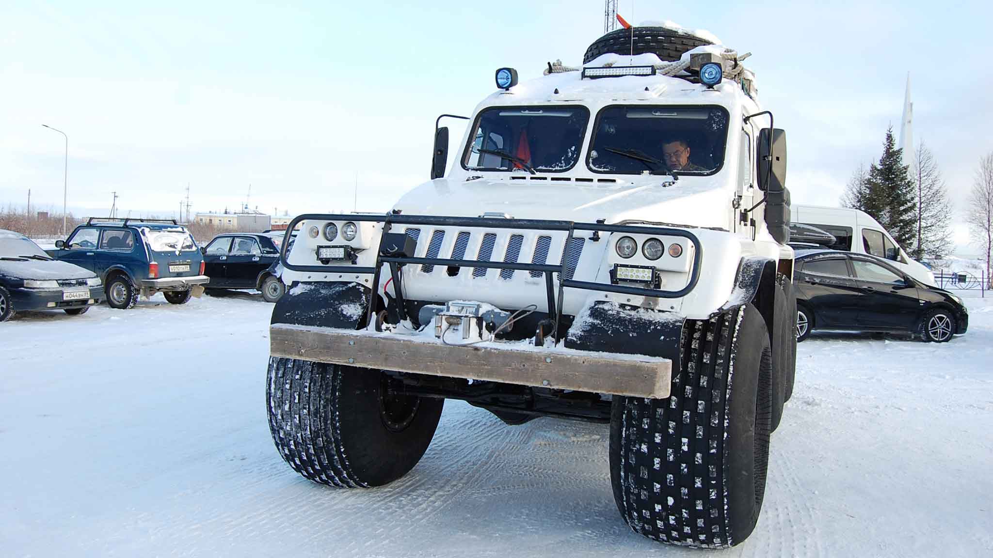 А дальше пересаживаемся на спецмашину — «ТРЭКОЛ», или транспорт экологический. Махина вместит 8-10 человек. Авто повышенной проходимости позволяет не только пробираться по бездорожью и даже переплывать реки, но и бережно относиться к природе. При въезде в тундру водитель спускает давление в шинах вездехода, и они не повреждают моховый покров местности.