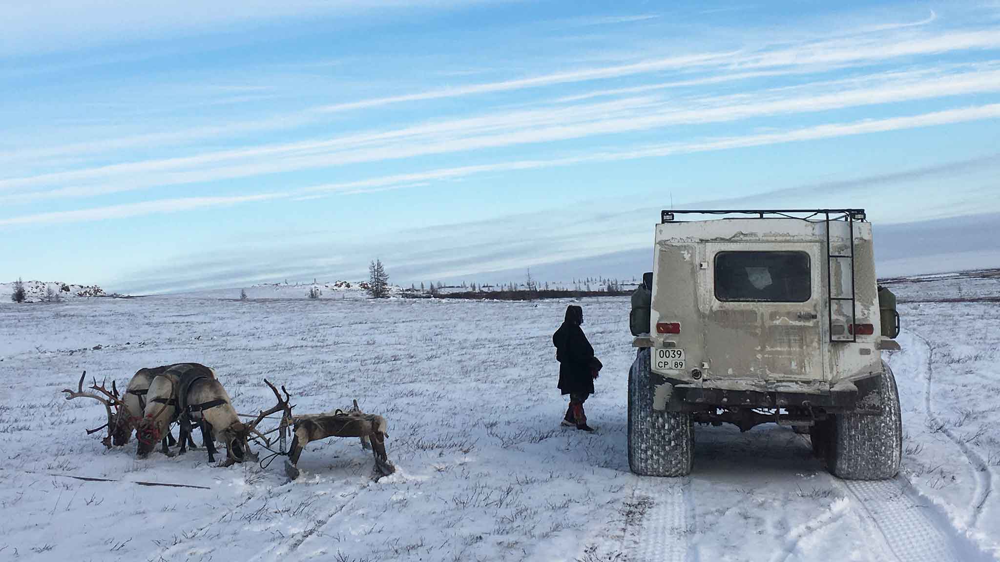 Чтобы добраться до стойбища оленеводов, нам нужен был проводник. Путь огромных машин вместе с нами проделала упряжка северных оленей. Ими управлял глава семейства оленеводов 36-летний Виктор Окотэтто.