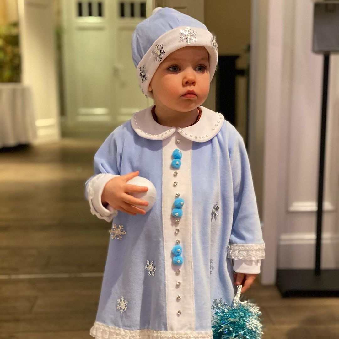 Модель Елена Перминова показала свою младшую дочку Арину в платье принцессы из сказки «Три орешка для Золушки». Нежно-кремовый наряд девочки расшит пайетками. Сверху Ариша надела жилетку из овчины серо-голубого цвета.
