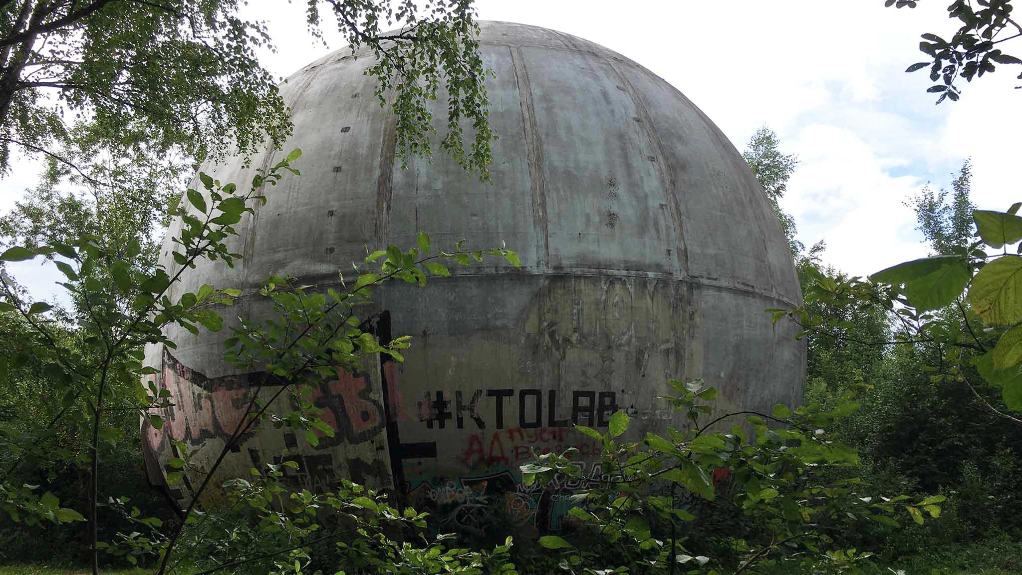 Оказывается, в этих краях военные собирались построить поселок. Домики спроектировали в форме чечевичных зерен из фибробетона. Но, увы, так они на бумаге и остались. Союз развалился. Сделать успели только одно — установить этот самый шар, чтобы впоследствии обустроить в нем зону отдыха с танцполом. Для этого планировалось сделать внутри несколько горизонтальных перекрытий.