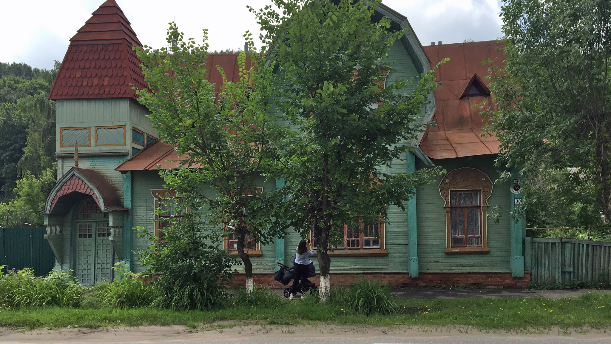 Однако мне были интереснее деревянные терема. Я привык, что дома эпохи модерна преимущественно кирпичные, и уже на въезде был сражен наповал деревянным особняком, одна из башенок которого выполнена из гнутых в кольцо бревен!