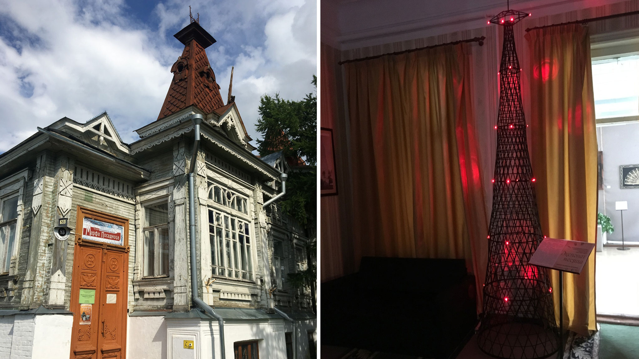 В музее нам включили главную красоту — перемотанный гирляндой, как елка, макет Шаболовской башни инженера Шухова. Гороховецкие котельщики клепали башню, зависая на тросах по семь часов без возможности спуститься вниз на перекур и другие надобности.