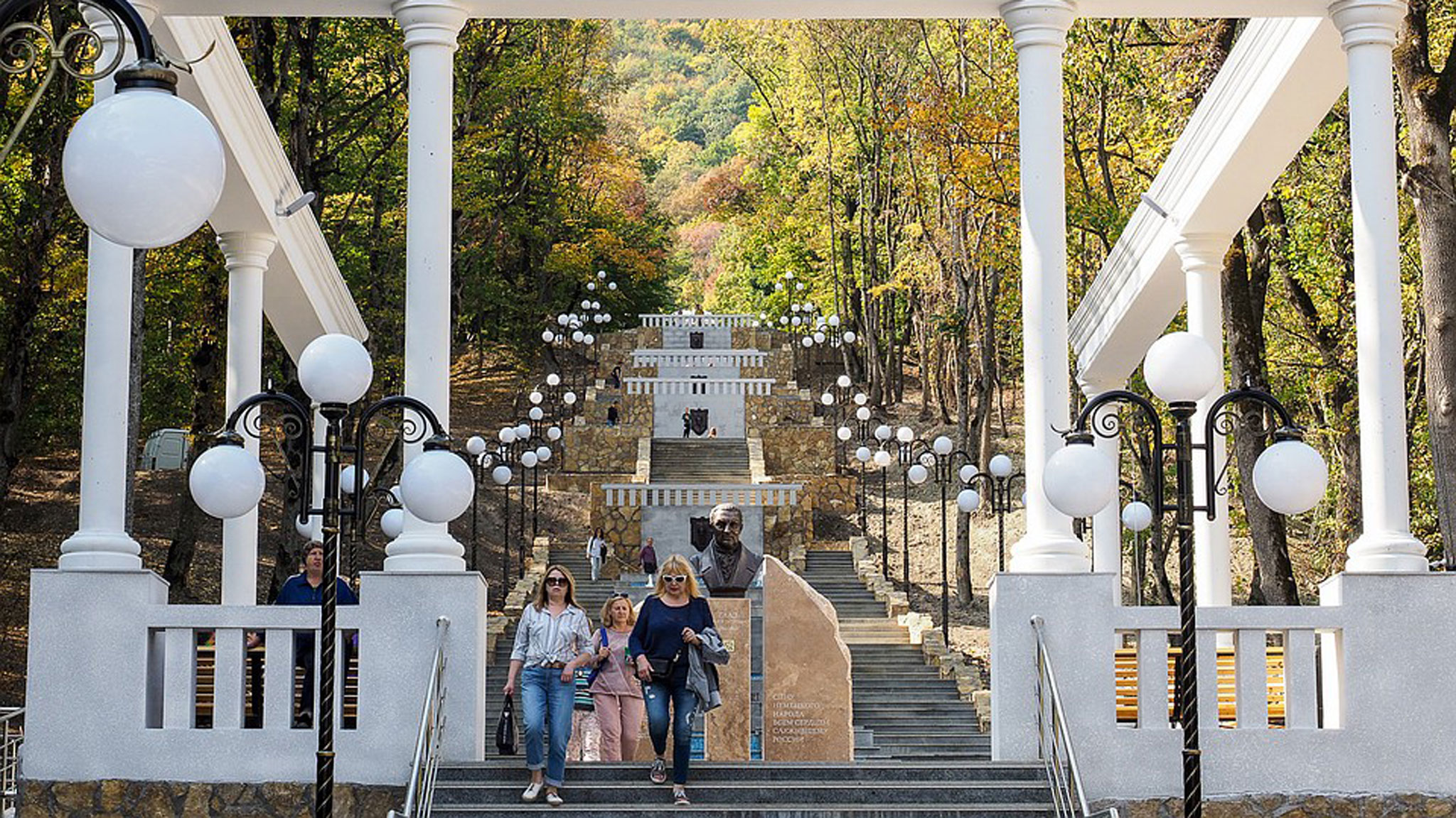 Главная достопримечательность Железноводска, открытая месяц назад, — Каскадная лестница. Точнее, открыли нижнюю ее часть, которую начали строить сто лет назад и не доделали. Это была самая мощная стройка Кавказских Минеральных Вод за прошедшие полвека. Ее длина — километр. Неспешно идти по ней в курортный парк — одно удовольствие. И польза для здоровья. Пролеты украшены барельефами бывавших тут писателей, поэтов и других знаменитостей. Ближе к основанию — бювет «Книга», посвященный Лермонтову.