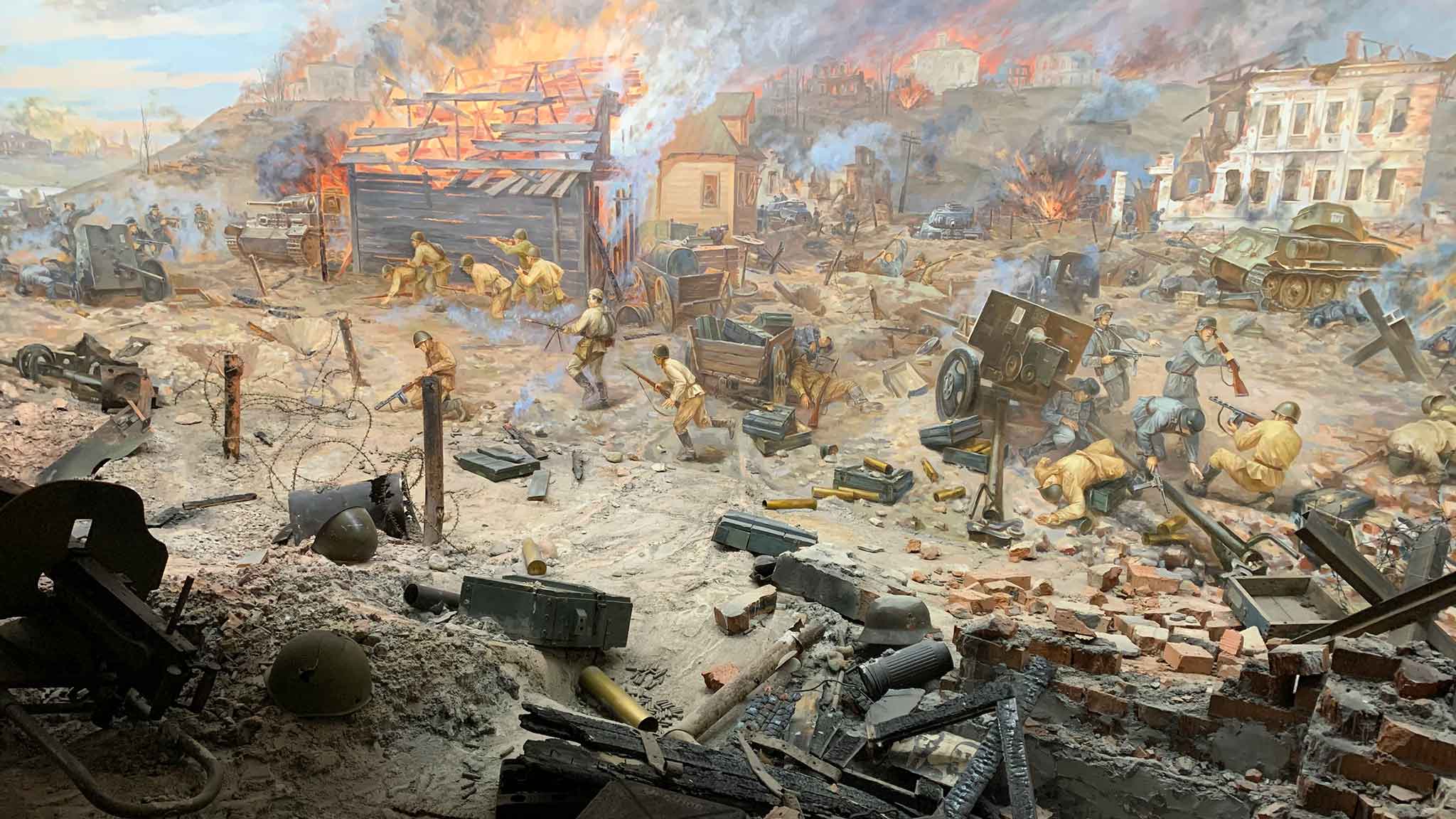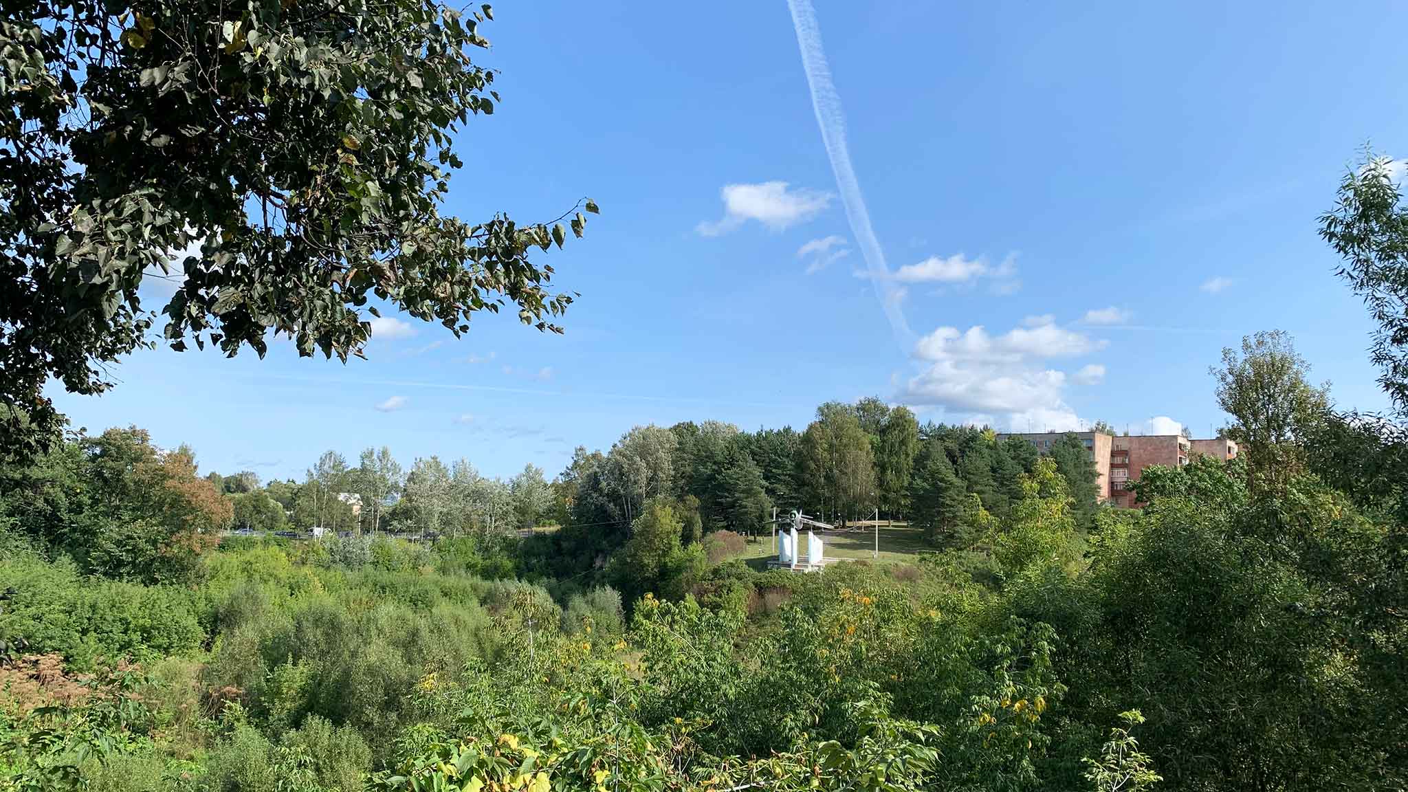 Со стороны города — балка, и на противоположной ее стороне словно только что приземлился МиГ, с этих истребителей во время Ржевской битвы армиям, попавшим в окружение, скидывали продовольствие.
