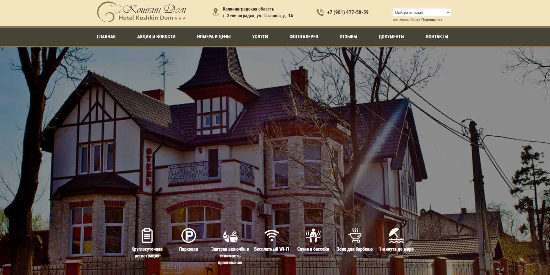Зеленоградск иногда называют городом кошек, поэтому неудивительно, что здесь есть отель с «кошачьим» названием. Гостиница находится в центре, недалеко от авто- и жд- вокзалов. Номера — от одноместных до класса «полулюкс». Есть трансфер, организация экскурсий, сауна, бассейн, прокат велосипедов для детей и взрослых, зона барбекю, стоянка, свое уютное кафе. До моря — 1 минута.
