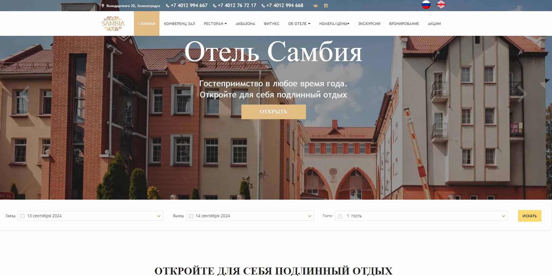 Самбия — историческое название полуострова, где сегодня расположен Зеленоградск. Одноименный отель находится на балтийском побережье, в нем 87 номеров, оборудованный бизнес-холл, личный ресторан, охраняемая стоянка, тренажерный зал, аквазона, солярий, площадка для детей, салон красоты и даже собственная янтарная комната. Гостиница организует трансфер, экскурсии по области, всевозможные мероприятия.