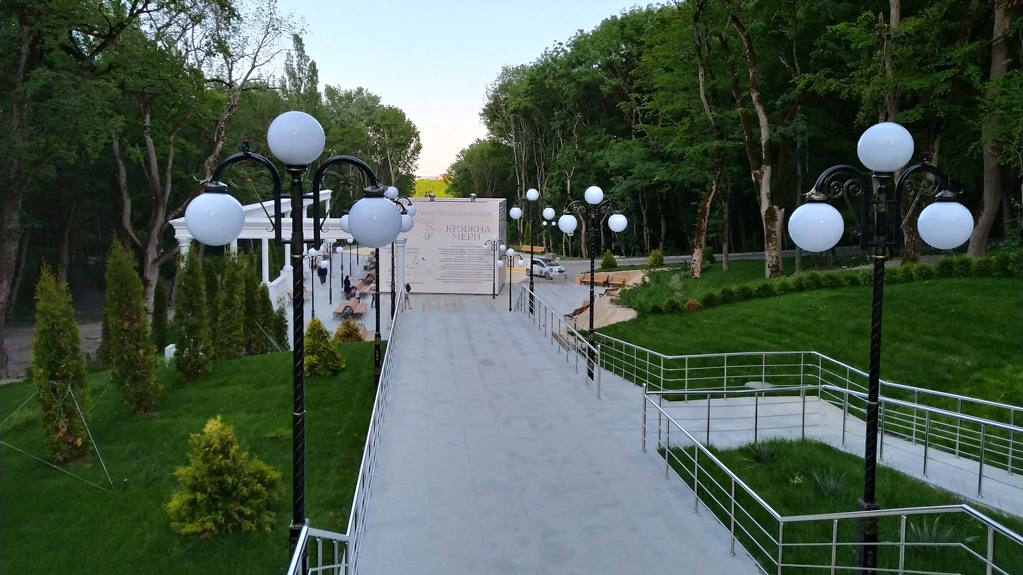 Самая длинная парковая лестница на юге России стала таковой в 2019 году, когда ее продлили до озера. Первую же часть «каскадки» построили еще в 30-е годы прошлого века. С мая по октябрь здесь работают многочисленные фонтаны. Площадки нижней части лестницы украшают барельефы Пушкина, Толстого, Александра I, Ермолова, Лермонтова, а также единственный в мире посвященный поэту бювет-книга. На ступеньках есть плоские таблички в форме кружек-бюветниц с указанием потраченных при подъеме калорий.