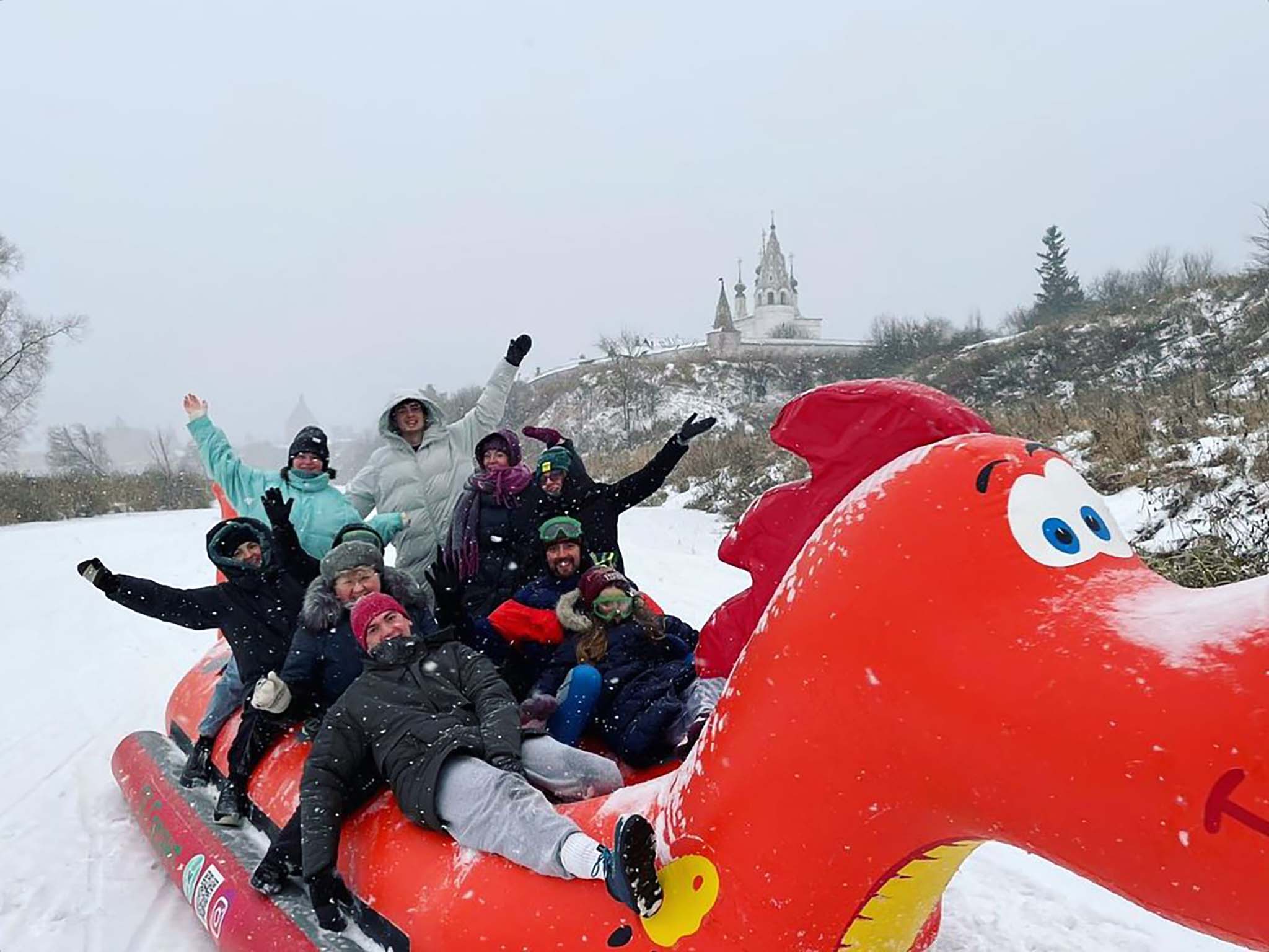 На прошлых новогодних праздниках телеведущий Александр Гудков отдохнул в Суздале вместе с друзьями и семьей. Компания совершила прогулку по городу и прокатилась на надувном драконе с горки. Артист шутливо сравнил это развлечение с новым сезоном «Игры престолов». «Рая бурерожденная», — иронично подписал снимок Гудков, посвятив комментарий своей матери Раисе.