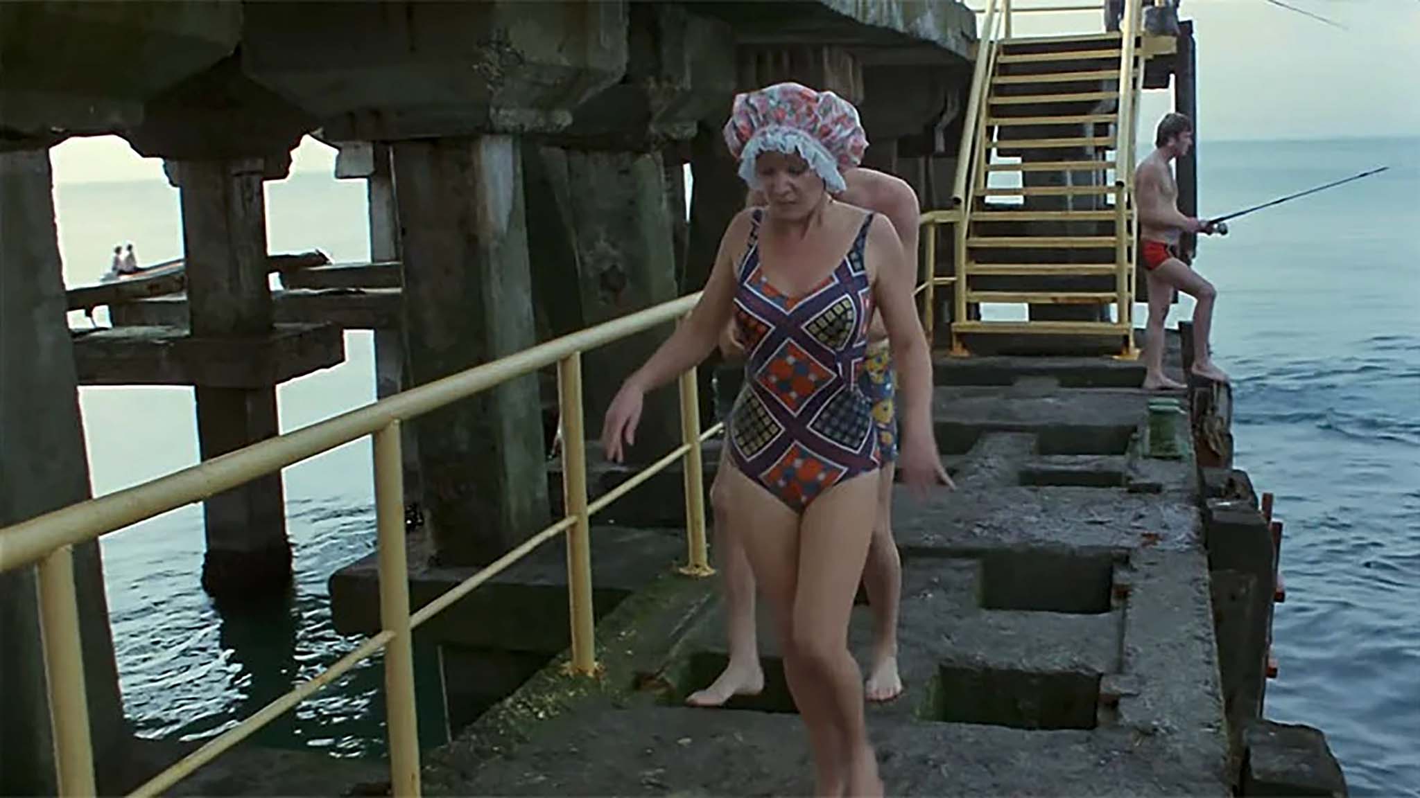 Людмила Гурченко в фильме «Любовь и голуби» прошлась по пирсу в закрытом ярком купальнике и забавной шапочке для плавания. Оба предмета одежды плохо сочетаются, но такова была задумка. Стоит учесть и то, что Гурченко на момент съемок фильма было под 50 лет, и появиться на экране в купальнике — довольно смелый шаг для артистки. Хотя, стесняться ей совершенно ничего, у Гурченко была идеальная фигура.