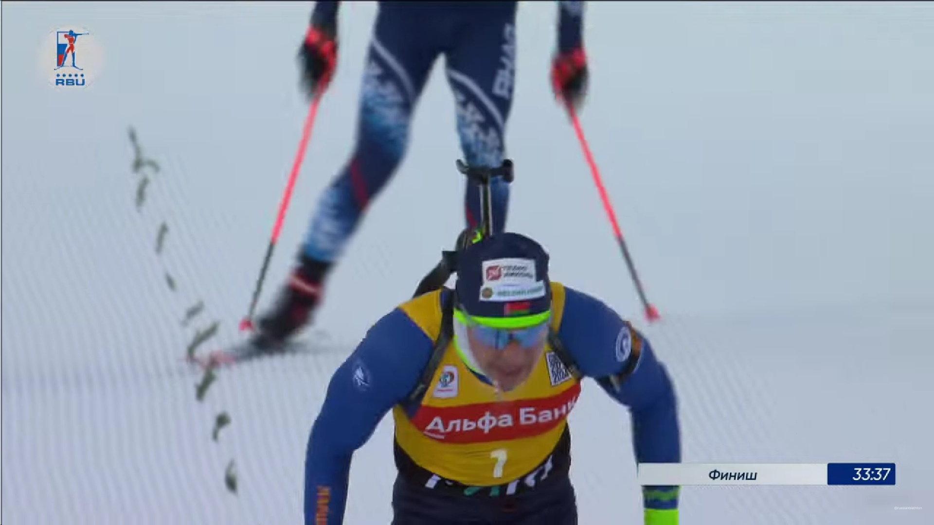 Белорусская группа биатлонистов далее по дистанции была впереди. Но рядом и наши. Отсечка 5,1 км. Смольский — лидер, за ним — Латыпов и Бажин. Все примерно на видимом визуально расстоянии друг от друга.