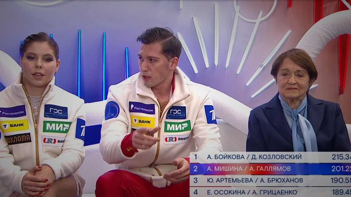 Сразу после финальной позы Галлямов выразил недовольство партнерше, что было заметно на камерах. В зоне Kiss and Cry (КиК) ситуация обострилась: на аплодисменты зрителей Александр саркастично ответил «Угу, еще бы» и продолжил упрекать Мишину. Он сказал: «Че, спрашивается, накатывали, делали прокаты? Для чего?». Их тренер Тамара Москвина вмешалась, отметив: «Ну одной недели прокатов недостаточно», на что Галлямов ответил: «Конечно». Москвина посоветовала: «Поднять можно и с места. В зале с места же поднимаешь», а Галлямов возразил: «Зал-то — всяко не каток». Когда появились баллы, Александр указал на экран и снова обратился к партнерше, но Москвина одернула: «Саша, прекрати». Мишина, до того молчавшая, ответила: «Соблюдай хотя бы приличия».
