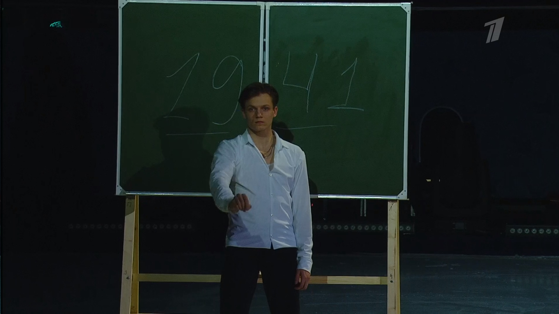 В один из моментов номера школьная доска, на которой Семененко написал «1941», раскрывается фигуристом. И на ней — фотографии ветеранов. У самого же фигуриста в финале проката рукава рубашки превращаются, по задумке, в журавлиные крылья.