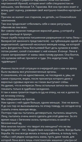 Двукратный олимпийский чемпион Евгений Плющенко обратился к уполномоченному при президенте РФ по правам ребенка Марии Львовой-Беловой с официальной жалобой на Ирину Костылеву — мать 14-летней фигуристки Елены Костылевой, тренирующейся в его академии. В обращении содержатся утверждения о фактах жестокого обращения с несовершеннолетней спортсменкой.