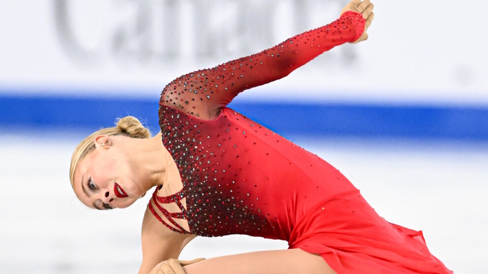 Итак, она начинает выступление с тройного лутца, но падает. Встает резко и быстро в надежде, что дальше будет все хорошо. Но следующий элемент загорается снова красным — потому что она падает с тройного сальхова и теряет каскад, двойной тулуп остался в черновиках истории. Снова — жесткий минус!