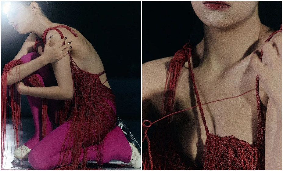 На ней спортсменка изображена на льду в наряде с длинной бахромой, а также на фигуристке были розовые лосины.