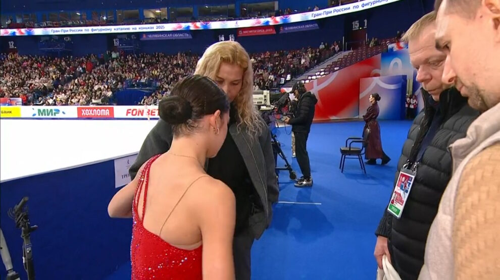 Аделия Петросян завершила день, рискуя с двумя четверными тулупами. Каскад 4T+2T не вышел, сольный 4T тоже не удался, но комбинации 3F+3T и 3Lz+2A+2A прошли стабильно. Итог? Когда же закончился прокат, то от Этери Тутберидзе она получила нагоняя, мол, что это все элементы были в сомнении. 223,00 балла обеспечили первое место, подтвердив ее статус фаворитки. Но когда же показали победные баллы Аделии, то тренер фигуристки Этери Тутберидзе посмотрела грозно на фигуристку.