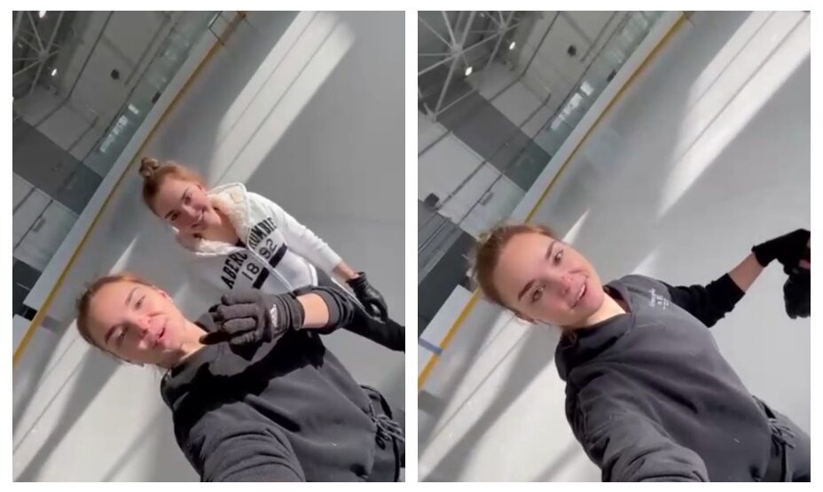Российские гимнастки Арина и Дина Аверины вышли на лед «Хрустального» в Москве. Сестры-близнецы отправили приветы фигуристкам, которые тренируются на этом катке.