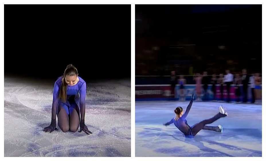 15-летняя ученица заслуженного тренера РФ Этери Тутберидзе представила свой показательный номер по мотивам фильма «Аватар». Спортсменка чисто выполнила программу. Оплошность произошла, когда все спортсмены выходили на лед и показывали свои лучшие прыжки «на бис». Здесь же усталость Валиевой дала о себе знать — фигуристка буквально рухнула на лед и даже не спешила подниматься. Стоит отметить, что даже падение у нее получилось грациозным.