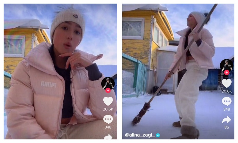 Алина в модном пуховике пыльной розы устроила танцы, а в конце и вовсе повалилась на снег. «Уборка это не мое. PS: смотреть до конца», — подписала она.