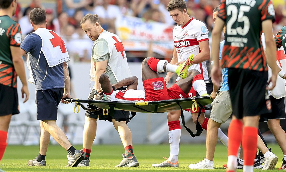 31-летний футболист получил по ногам в матче с «Уралом». Футболист не смог самостоятельно покинуть поле, его вывезли на носилках в сопровождении врачей.