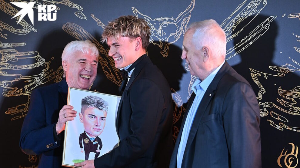 И вот настал главный момент вечера. Полузащитник «Зенита» Андрей Мостовой официально получил свою награду. Он вышел на сцену в смокинге, с которым ему помогали Булыкин и Семшов. Ну а награду футболисту вручают лично главный редактор «Комсомолки» Олеся Носова и легенды российского футбола — Евгений Ловчев и Анзор Кавазашвили.