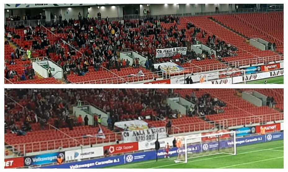 Российские болельщики почтили память погибших игроков и персонала ярославского «Локомотива» во время второго тайма матча отборочного тура между сборными России и Мальты. На баннере фанаты написали «Со льда в вечность».