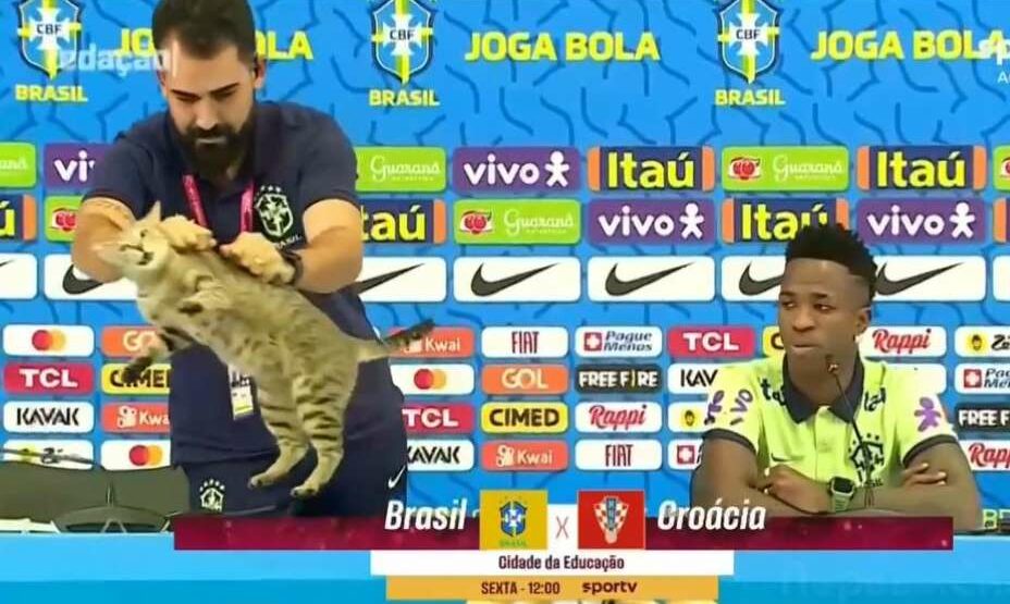 На одной из конференций на чемпионате мира-2022 кот запрыгнул на стол в то время, как свои комментарии давал нападающий Винисиус Жуниор. Представитель команды взял и грубо скинул животное со стола, схватил кота за шкирку.