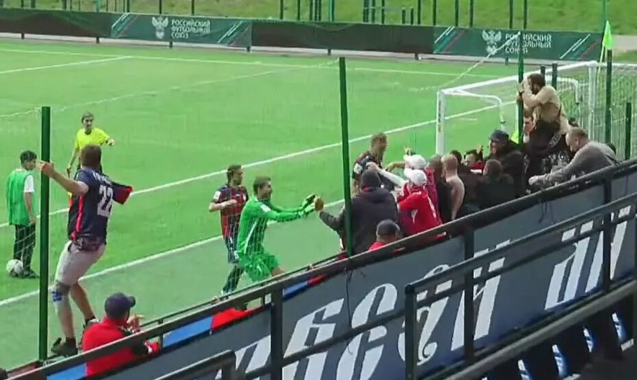 Конфликт был погашен и многие футболисты ушли в раздевалки. Но один из игроков «Ессентуков», услышав оскорбления с трибун, взял мяч и пнул его в сторону фанатов СКА.
