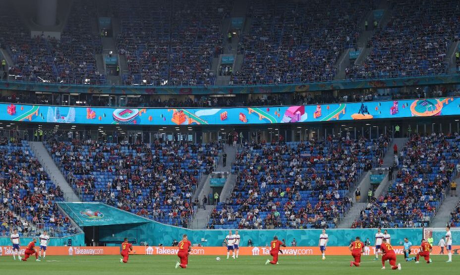 В это же время бельгийские игроки, а также испанская арбитров встречи преклонили колено. Трибуны стадиона «Газпром-Арена» их освистали за такую акцию.