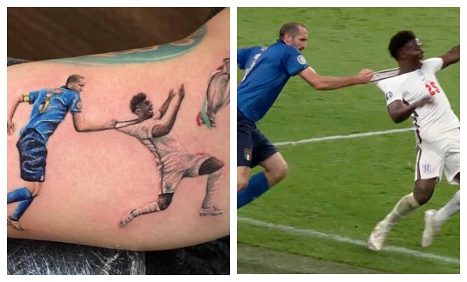 Фанат сделал татуировку с моментом, когда во второй половине игры защитник «скуадры адзурры» Джорджо Кьеллини намеренно нарушил правила на полузащитнике сборной Англии Букайо Саке, удержав его за майку, когда тот пытался оторваться от соперника по бровке. Он добавил в рисунок чемпионский кубок, придав эпизоду новый окрас. Получилось, будто итальянец оттягивает 19-летнего хавбека, не пуская к кубку чемпионов.