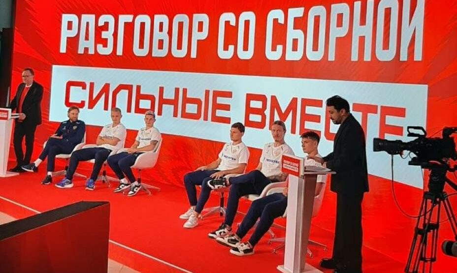 Если Валерий Георгиевич смотрелся в кресле ток-шоу очень органично и пытался остро отвечать на не самые футбольные вопросы, то игроки сборной России точно не привыкли к такому вызывающему формату. Все было горазд скромнее, чем у Карпина.