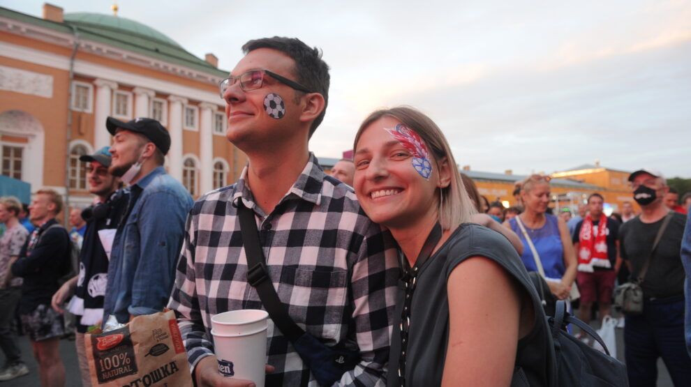 Если у вас вдруг возник вопрос – а что там насчет масочного режима? – отвечаем: можно сказать, что масочного режима на фан-зоне нет, и при этом не сильно ошибиться. То есть, он, конечно, официально действует, но на практике его соблюдает слава богу если каждый двадцатый. Зато по всему периметру расставлены дозаторы с антисептиками, а на входе всем новоприбывшим в обязательном порядке замеряют температуру.