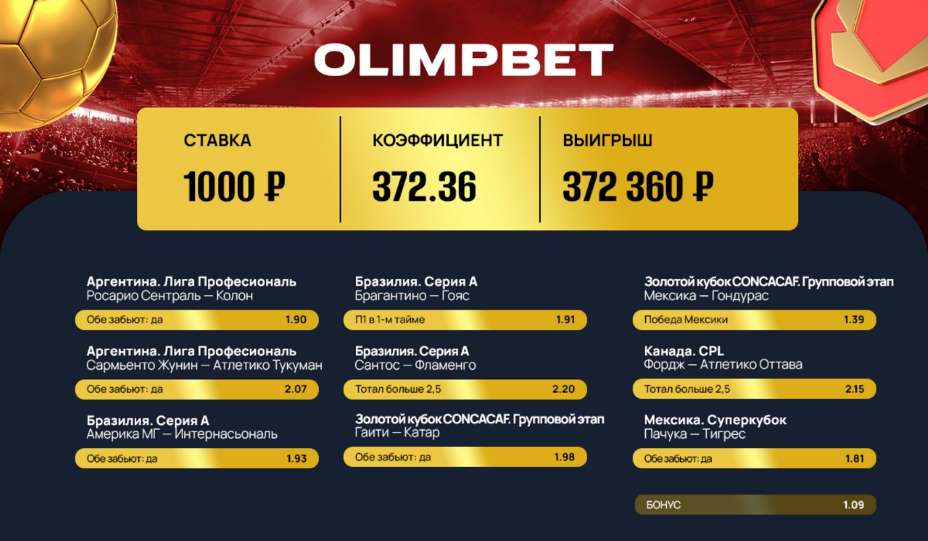 Большие экспрессы обычно бьют по нервам беттеров. Но клиент Olimpbet добавил в купон девять событий, и ни за одно из них ему не пришлось переживать на последних минутах. Поставив 1000 рублей на экспресс с общим коэффициентом 372.36, он выиграл 372 360 рублей.