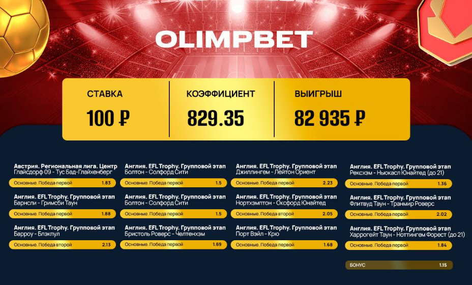 Клиент Olimpbet собрал экспресс из 11 футбольных событий с общим коэффициентом 829.35, включая бонус на экспресс от букмекерской компании. Ставка была скромной — 100 рублей. Но знание английского футбола и удача принесли выигрыш 82 935 рублей!