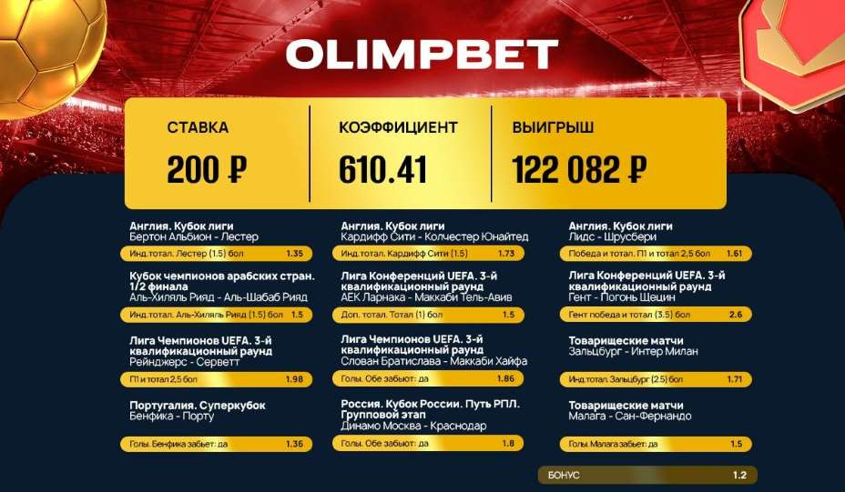 Клиент Olimpbet составил экспресс двенадцати футбольных событий и получил 122 082 рубля со ставки в 200. Общий коэффициент пари с учетом бонуса 1.20 составил 610.41.