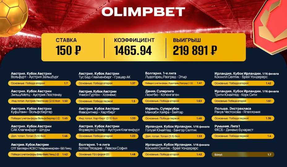 Очевидно, что беттор хорошо знаком с футболом, особенно с австрийским. Половина событий — поединки в Кубке Австрии. Кроме того, клиент Olimpbet выбрал для ставки три матча в Кубке Ирландии, два — в первой лиге Болгарии и по одному в чемпионатах Дании, Польши, Румынии и Суперкубке Израиля.